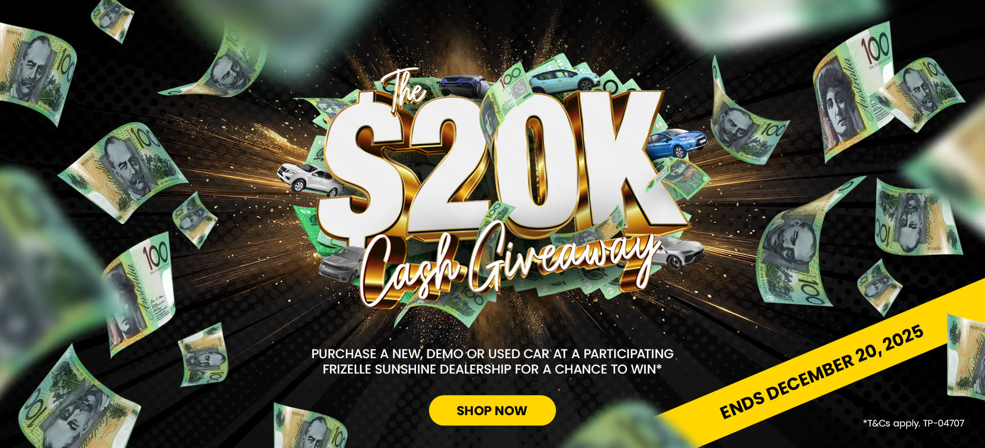*Terms and conditions apply. *During the promotional period from 8 November to 20 December 2025, customers will be eligible to receive one entry into the draw for the chance to win $20,000 cash upon the purchase and delivery of a new, demonstrator or pre-owned vehicle from participating dealerships. Customers can earn additional entries by: **. One additional entry for financing their vehicle with an approved Finance Partner of FSA. Finance is available to approved applicants only. Terms, conditions, fees, and charges apply. Frizelle Sunshine Automotive Finance Managers are Accredited Introducers of finance under the Point of Sale exemption and act as referrers to our finance providers. We are not licensed to provide financial advice. Finance approvals are subject to the lender’s credit criteria, and additional requirements may apply. Loan amounts, interest rates, and repayment terms will vary depending on your individual circumstances. Please speak with one of our Finance and Insurance Managers for further information or to discuss your finance options in more detail. ***. One additional entry when trading in current vehicle when purchasing during the promotional period. ****. One additional entry for purchasing $500 or more in Car Care product/s. *****. One additional entry with a purchase of $500 or more of accessories. Additional entries can only be earned when purchasing a vehicle and not as stand-alone purchases. Entrants must be 18 years and over and must reside in NSW or QLD. Excluded purchases by rental, government and large fleet customers. Novelty ticket will be issued to customers on delivery of vehicle by no later than 20 December 2025. Each novelty ticket is one electronic ticket that will be assigned to the customer prior to the draw. NSW Permit: TP-04707